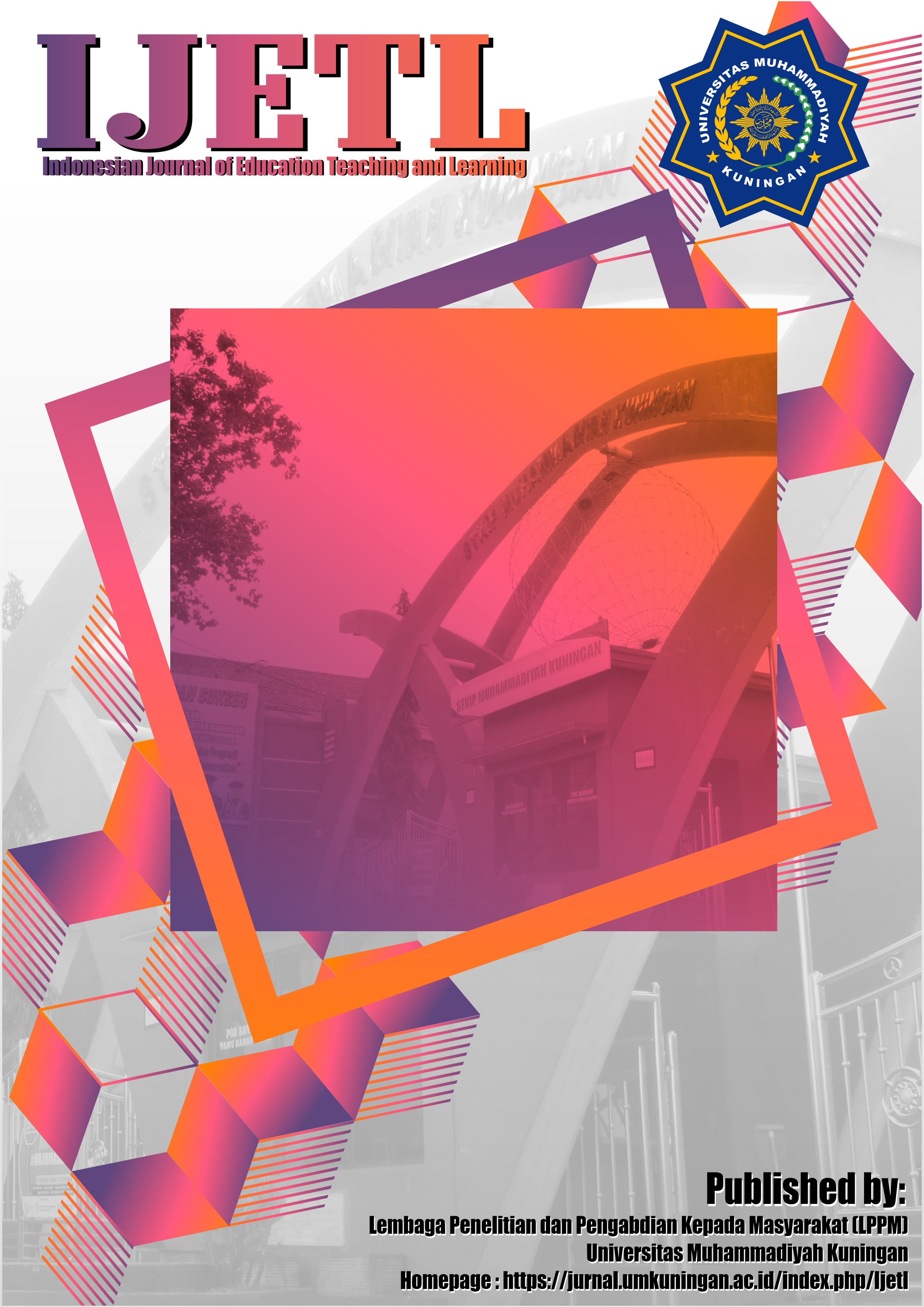 Indonesian Journal of Education Teaching and Learning (IJETL) is a national scientific journal published by the Institute for Research and Community Service (LPPM) STKIP Muhammadiyah Kuningan which contains research results raised from theoretical studies and research results in the field of education and teaching. The Indonesian Journal of Education Teaching and Learning (IJETL) is published twice a year, namely in March. The purpose of this journal is to facilitate scientific publication which is the result of research conducted by students, teachers, academics and researchers. Indonesian Journal of Education Teaching and Learning (IJETL) contains various disciplines of Education and teaching, especially in the scope of Educational Theory and Practice, Educational Management and Administration, Educational Policy and Leadership, Educational Measurement and Evaluation, Construction of Teaching Materials, Development of Teaching Methods, Development of Pedagogy and Curriculum, E-learning, Learning difficulties, and Psychology of learning.