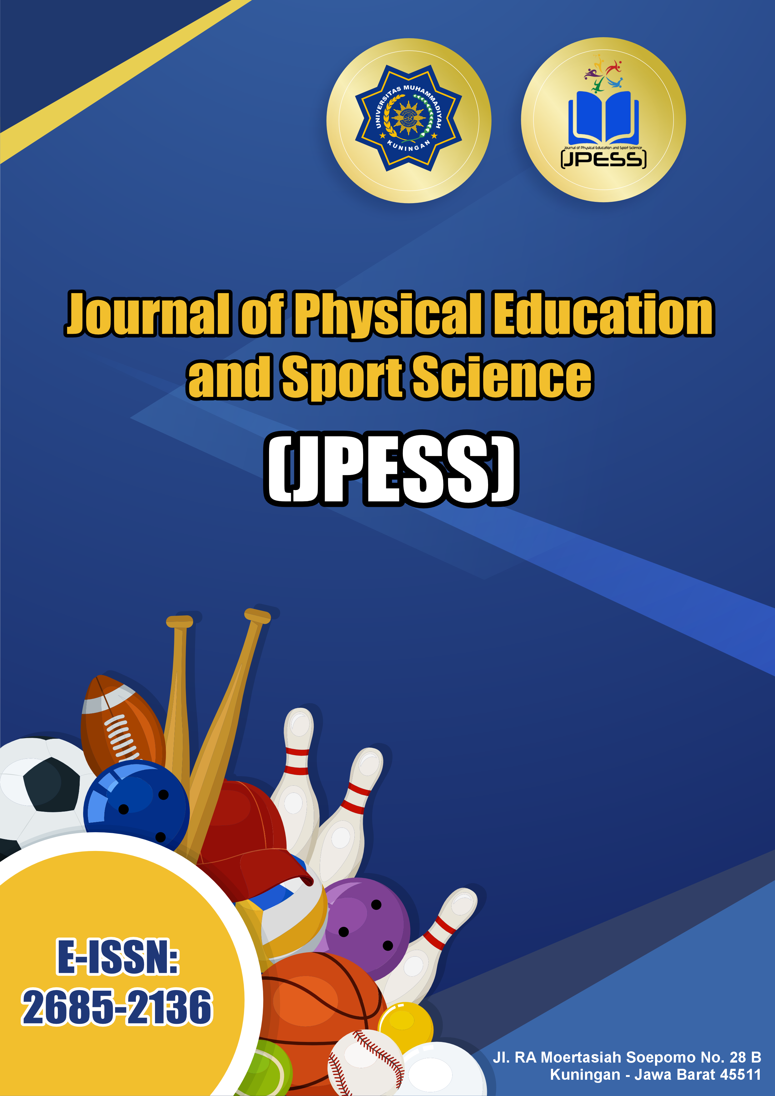 Journal of Physical Education and Sports Science biannually publishes research on various aspects of the sports and exercise sciences, including anatomy, biomechanics, performance analysis, physiology, psychology, sports medicine, sports nutrition, health, and well-being, as well as coaching and talent identification and physical education. Journal of Physical Education and Sports Science is a journal published by the Department of Physical Education, Health and Recreation, Universitas Muhammadiyah Kuningan. The purpose of this journal is to facilitate scientific publications which are the results of research conducted by students, teachers, academics and researchers. All articles published in this journal have undergone rigorous peer review, based on initial editor screening and anonymous refereeing. research results in the fields of Physical Education and Sports Science.